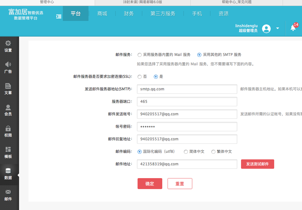 大商创后台系统设置 - 邮件服务器设置,不废话,直接上图,不配置好,前台好多500弹框错误哈。另外还需要配合服务器openssl跟邮箱的smtp功能,否者也是成功不了的,欢迎有偿咨询,承接新开大商创维护业务。