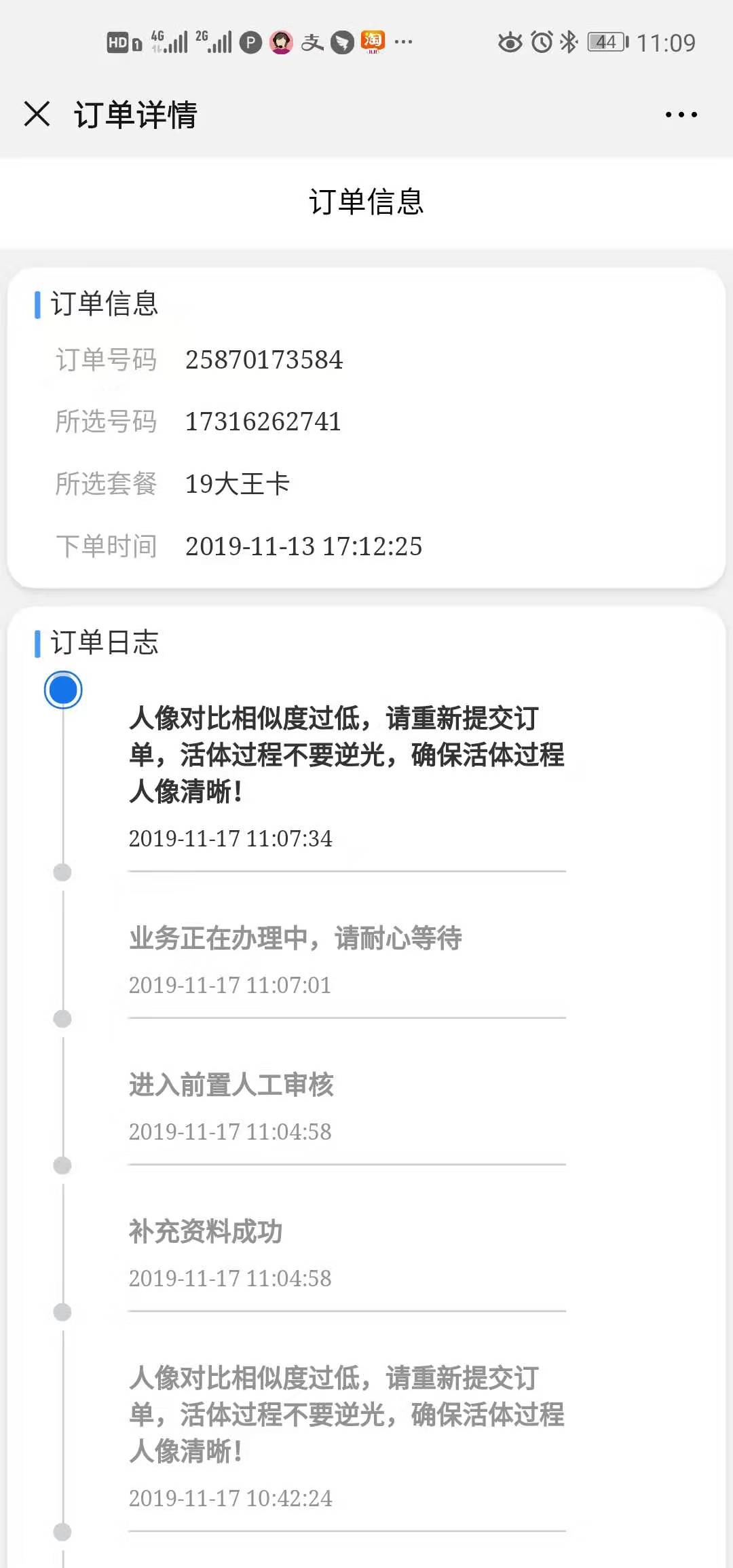 搞了十来次还是不行,注意,认证失败了要重新开始选号的,从头开始,没号给你选也是很常见的,咨询客服,客服推荐我换19块100G的电信纯流量卡(电信物联网卡),说认证没那么困难,认证困难是运营商把关的,他们做不了主,也不知道怎么认证好通过的,经历过这十几次认证,我都觉得自己是神经病了,找了单色的墙,又光线好的,又不戴眼镜,又没有杂音的。不说了,如果这样的话,我10天也激活不了。最后我还是没同意换卡,接下来几天就是退货了,商家是各种扯皮,责任都退到营运商跟站长身上了(本人跟身证件照片差距大,的确这几年长肥了不少),最后还是通过交易纠纷成功申请退款。