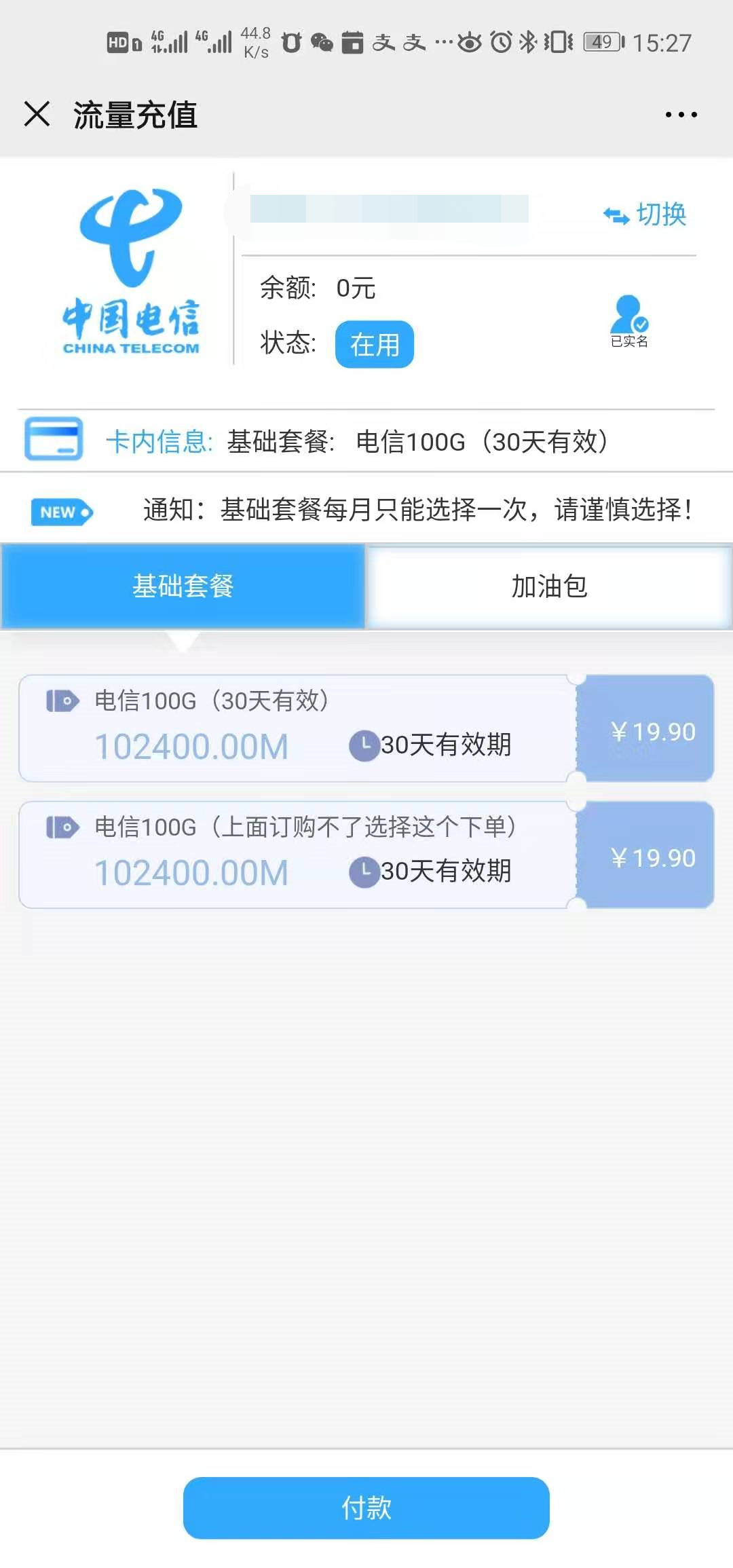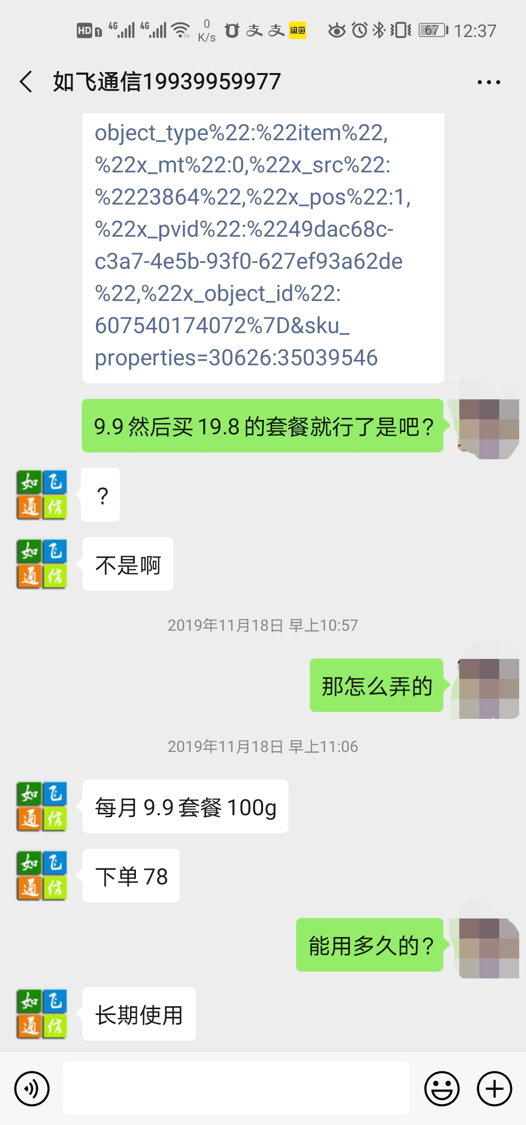 差不多将就着用了两个月,准备再充值的时候,发现要坑死了哈,商家保证的9.9永久使用没有了,直接说,这回买套餐也不像之前的了,之前9.9直接付掉就行了,现在你要先把钱充到余额里再购买套餐,充值的金额又是大于套餐金额的,所以余额基本上都是用不完的,其实不看视频偶尔玩一两款游戏的话,一个月流量撑死也就20G-30G,这样算下来两个月,一个月差不多50快钱25G吧,这个价位我还不如去搞运营商的卡呀,真是后悔哈。这里站长还犯了一个错误,原先是通过旺旺联系的,后来又直接通过微信联系商家了,现在是想投诉也不好投诉了哈,只能认怂了哈。